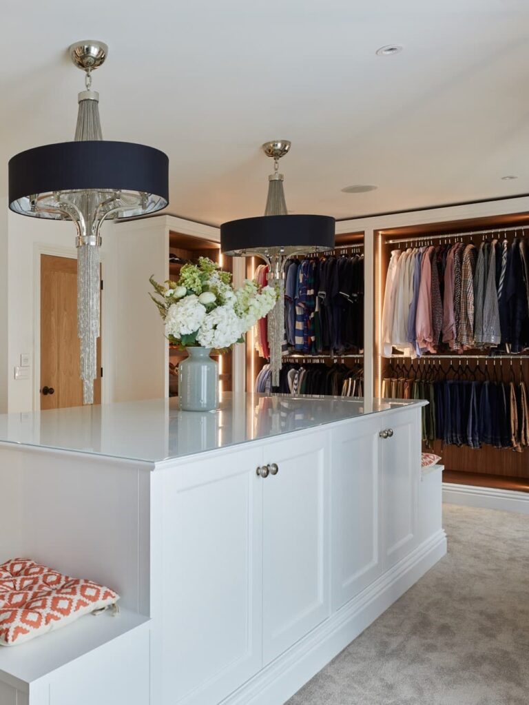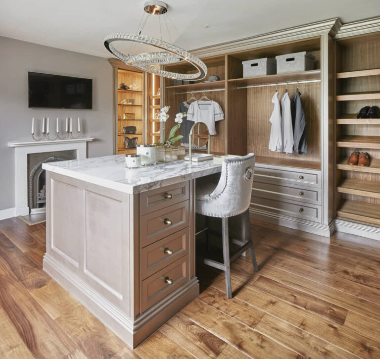 Open shelving provides effortless access to wardrobe essentials, while the bespoke central island offers a dual-purpose design – Long, sleek drawers on one side and an integrated dressing table on the other.